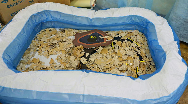 - アカエイが砂の中にもぐったり、砂の中からでてくる様子をあらわした展示物も感動でした。おもしろくて楽しい展示です。アカエイは、三番瀬で最も危険な生物とされています。私たちが三番瀬市民調査をおこなうときもいちばん注意している危険生物です。