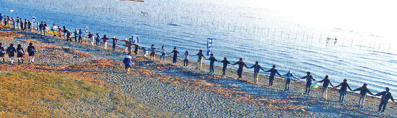 市民500人が三番瀬で手をつなぎ、「人間の鎖」で埋め立て計画撤回を訴えた。