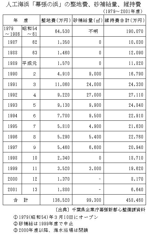「幕張の浜」の砂補給と整地に要した費用は1979〜2001年度の23年間で45億8000万円に上る。それでも侵食が止まらないため、県はとうとう砂補給を1999年度で中止した。利用者の安全を確保できないとし、海水浴や水浴びも禁止した。