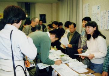 資料コーナーは、さまざまな団体がもちよった書籍や資料などを買い求める人でにぎわった。写真は、三番瀬保全運動をすすめている「千葉の干潟を守る会」と「三番瀬を守る署名ネットワーク」の販売・署名コーナー。
