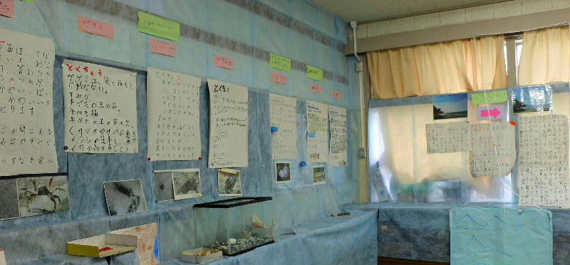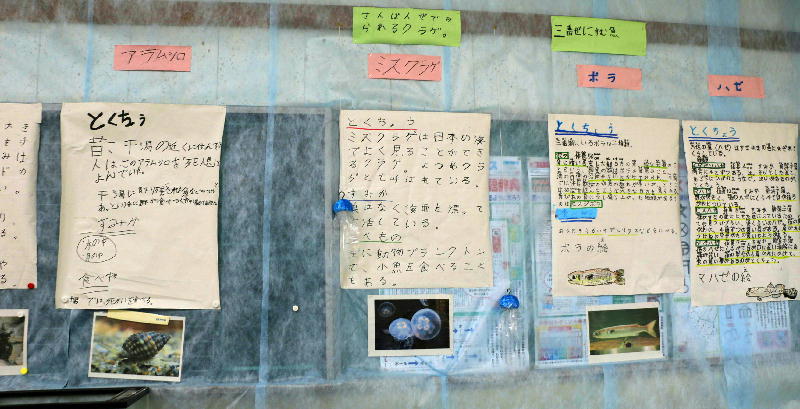 船橋市立小学校3学年の児童は11月6日、「八木が谷三番瀬はくぶつかん」をプレオープンさせました。空き教室を利用してです。魚や貝類、野鳥など、いくつものグループに分かれ、三番瀬で見られるさまざまな生き物や干潮・満潮のしくみなどを紹介しています。どれもユニークで、たいへんすぐれた展示です。その一部を紹介させていただきます。