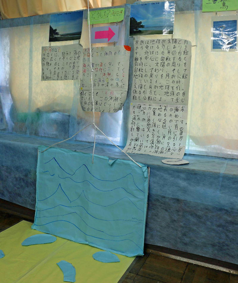 干潮と満潮のしくみを説明した展示。滑車ひもを引っ張ると海水面がどんどん上昇し、説明文が隠れます。