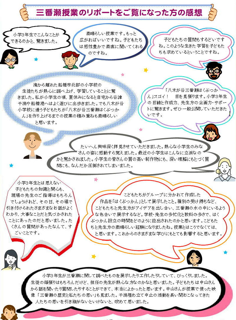 そこで、同校の先生から、「三番瀬の歴史をテーマにした小学3年生の授業に来ていただき、児童の質問に答えてほしい」との依頼をいただきました。私がホームページ「三番瀬を未来に残そう」などで三番瀬保全運動の歴史や現在の動きなどをくわしくとりあげているからです。